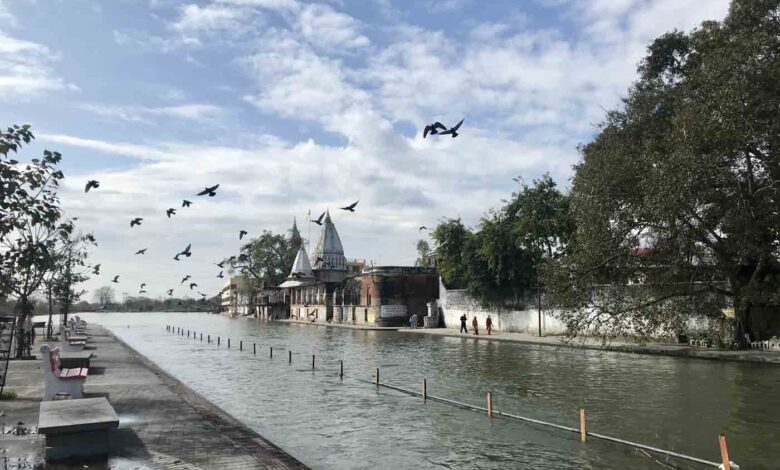 Kankhal, close to Daksha Prajapati temple, is primarily a cremation or shamshan ghat, adorned with several majestic structures from the 17th and 18th century. Many sites built in Rajput and Mughal architecture decorated with beautiful wall paintings can be seen here. Havelis of Raja Bharmal and the King of Patiala are the most fascinating out of all the buildings. Many Akharas also dot the landscape of Kankhal. According to Vayupuran, this is the place where Goddess Ganga tells Bhagirath that, “I am blessing the places I am flowing through, but as I am flowing through Kankhal, I am the one being blessed”. The cremation ground, where people congregate to immerse ashes of the dead is well known. The precinct is surrounded by Shri Panchayati Akhara, Bada Udasin Temple and Raj Ghat. Though the site is ancient, the pavilion itself was constructed in 1952. The mythical story associates Kankhal and Shamshan Ghat with Uma Devi or Sati. It is believed that a person achieves salvation if his cremation is performed at the bank of Ganga in Kankhal. The entrance is through a rectangular gate having a small shikhara, leading to an open court. It has sacred trees and places to sit. The main entrance gate has colonnades on either side, which is used as a waiting area. It has a flat roof with a series of square pillars supporting the structure. A rectangular, walled veranda is supported over rectangular pillars besides the riverside and is utilized for funeral rites. Stone paved steps lead up to the river.