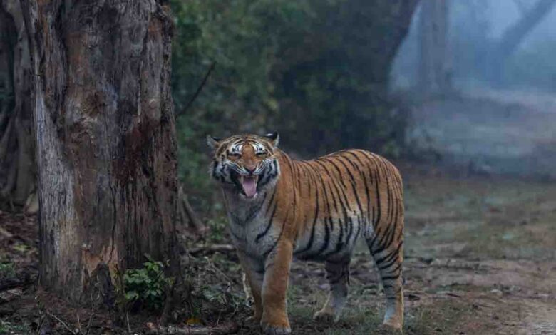 People visiting Dhikala zone of Jim Corbett National Park looked exulted after having a thrilling tiger sighting. They said that it was a magical sight when a full-grown tiger had appeared on the Sambhar Road. “We were stunned with the sight. It with its majestic presence appeared with a confident stride,” one of the visitors said.